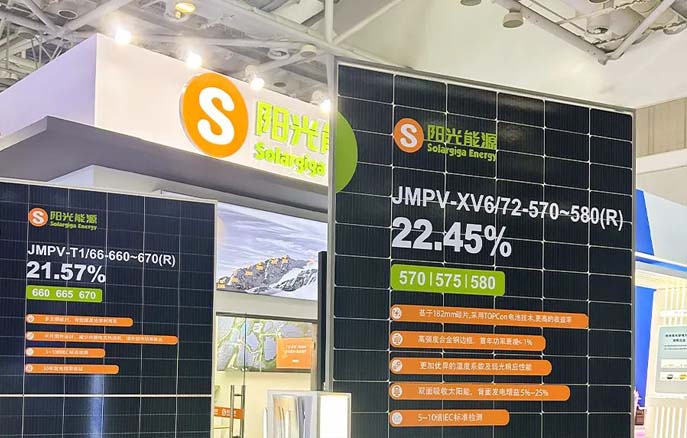 本届展会,阳光能源重点展示了Giga-N系列两款高效产品,分别是182 72版型双玻和182 54版型单玻全黑组件,采用前沿的N型TOPCon技术,具备高效率、高发电量、高品质等多重优势,能够为客户带来更高的价值。其中,182 54版型单玻全黑组件是阳光能源面向全球分布式市场打造的高端产品之一,外观精美,量产效率可达21.76%,被广泛应用于建筑屋顶等应用场景。