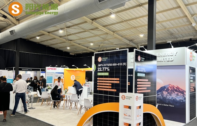 本届展会,阳光能源针对南非分布式市场的快速发展,展出了4款应用于分布式场景的高效组件产品。其中一款54片矩形高效组件凭借其全黑的外观优势,获得了现场观众的广泛关注,组件采用N型TOPCon电池技术,量产转换效率可达22.53%;值得一提的是,该款组件整体重量仅20.7KG,便于安装的同时,全黑小尺寸设计也更受高端住宅等应用需求的青睐。此外,同步展出的还有两款66片和1款72片N型组件产品,涵盖182mm和210mm多种规格,均提供30年功率质保,有效保障终端业主收益。