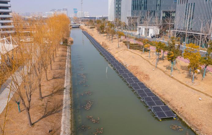 盐城西伏河防眩光漂浮式光伏电站采用了先进的漂浮式光伏系统设计,其核心在于精密的锚固系统,该系统如同水下根系,有效抵御风浪冲击,确保光伏阵列的稳固性。这一技术突破不仅释放了水域空间的巨大能源潜能,更标志着“向水要电”新时代的开启。